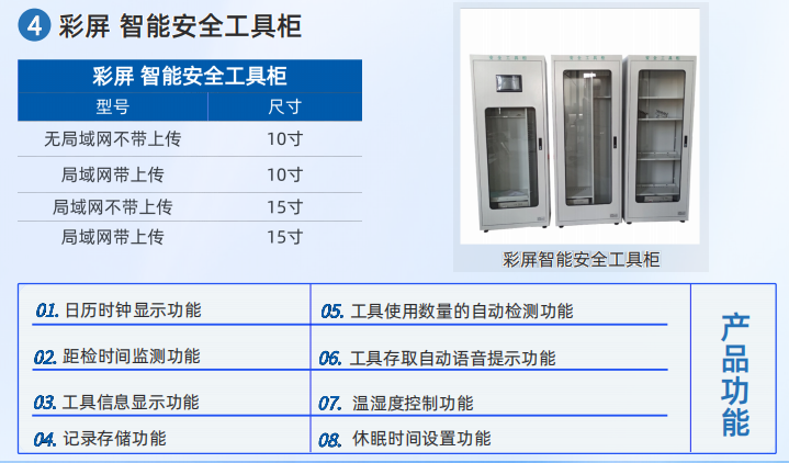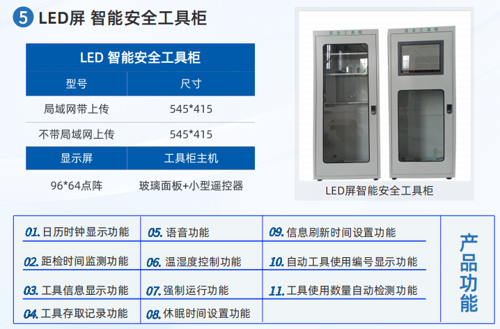 LED屏智能安全工具柜是在智能工具柜的基础上增加了语音功能、距检时间监测功能、工具存取记录功能、工具信息显示功能等,并且外观上是LED屏显示。LED屏智能安全工具柜的详细功能如下!