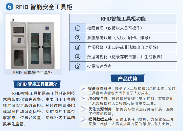 RFID 智能工具柜是基于射频识别技术的智能化管理设备,主要用于工具的精准追踪与高效管控。其通过内置 RFID 读写器自动识别标签,实时监控工具存取状态、位置及数量,实现柜内工具的数字化监管。