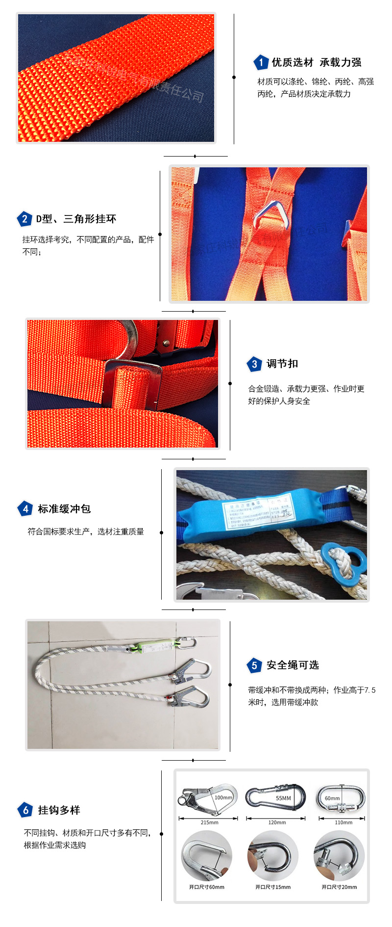 安全带系列:电工安全带,高空作业安全带,防坠落安全带,全方位安全带,全身式安全带,双背安全带,双保险安全带,单腰安全带,单背安全带,白色安全带,橘红色安全带,安全带缓冲器,绞绳、编织绳、拉线保护管,脚扣,登高板。